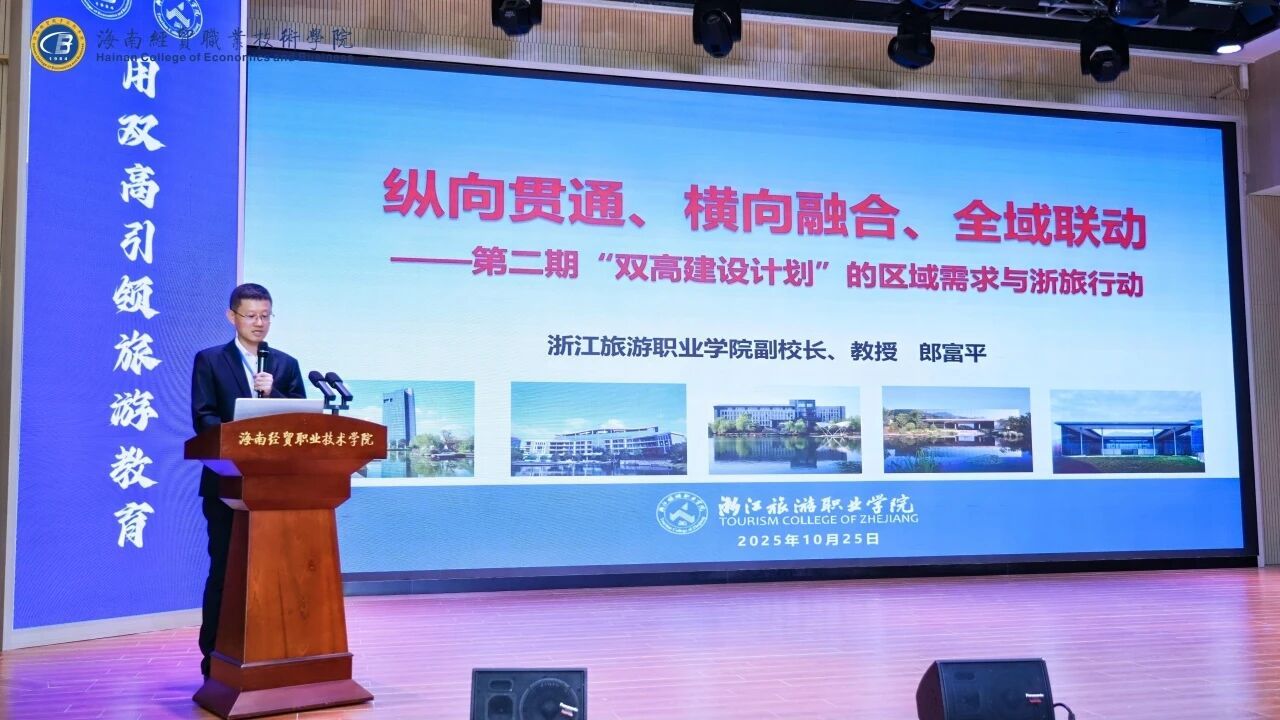 会上,我校与海南经贸职业技术学院、宁夏工商职业技术大学、长沙商贸旅游职业技术学院、北京财贸职业学院等五所“双高计划”建设单位代表,结合区域发展需求,分享了旅游大类高水平专业群建设的创新路径与实践经验。副校长、酒店管理与数字化运营专业群带头人郎富平作题为《纵向贯通、横向融合、全域联动:第二期“双高建设计划”的区域需求与浙旅行动》的主题报告。他从国家战略引领、省域发展驱动与行业需求倒逼三个层面,系统阐述了我校酒店管理与数字化运营专业群的建设路径与创新举措:一是纵向贯通,推进长学制建设,探索“中职—高职—职业本科”的学生成长立交桥;二是横向融合,搭建“千岛湖县域产业学院”和“现代旅游行业产教融合共同体”等产教融合平台,提高人才培养适配性,促进教育链、人才链、产业链和创新链有机衔接;三是全域联动,集结政校行企力量,全面推进人工智能赋能教育教学改革、提升“职教出海”影响力并服务共同富裕示范区建设。