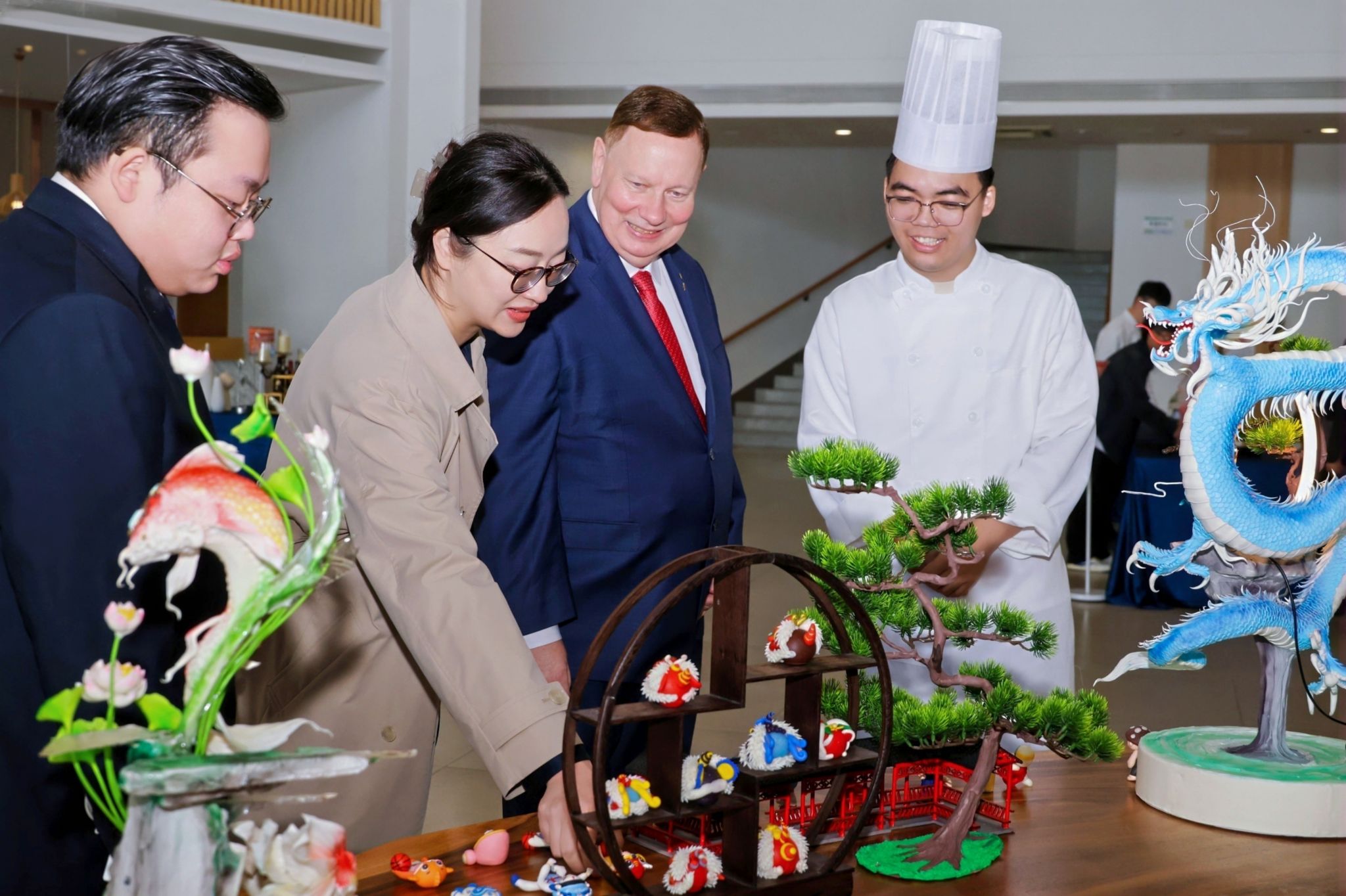 活动现场,一场由中澳国际酒店管理学院师生联袂呈现的教学过程与成果展吸引了众人目光。酒店管理与数字化运营、西式烹饪工艺、中西面点工艺等专业教学成果集中亮相,成为双方理念互鉴、人才共育的鲜活实践。嘉宾们穿行于咖啡、茶艺、酒水、前厅、糖艺、面塑等多门实训课程展示区,在沉浸式体验中,切身感受中澳教育融合的教学魅力。
