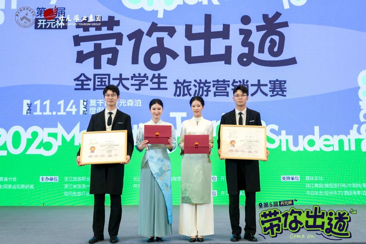 11月14日,第五届“开元杯”全国大学生旅游营销大赛在德清莫干山开元森泊度假乐园圆满落幕。由我院黄怡博、王天成、史奇、陈一红四位同学组成的参赛团队,凭借扎实的专业功底、创新的营销方案和富有特色的现场表现,在比赛中脱颖而出,荣获大赛一等奖。指导教师王琪、杨国强获评“优秀指导教师”奖。