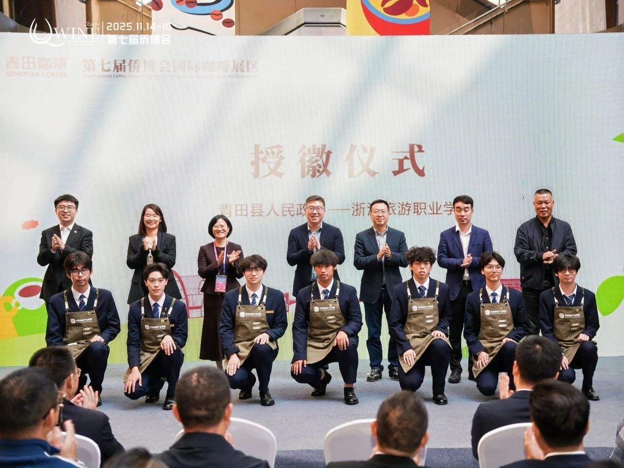 11月16日,在第七届华侨进口商品博览会现场,青田侨博广场咖香四溢、氛围热烈。青田咖啡产业学院第四届学子授徽仪式在国际咖啡展区签约大会上隆重举行,标志着校地合作在“产业+教育+人才”培养模式上的又一次扎实落地。