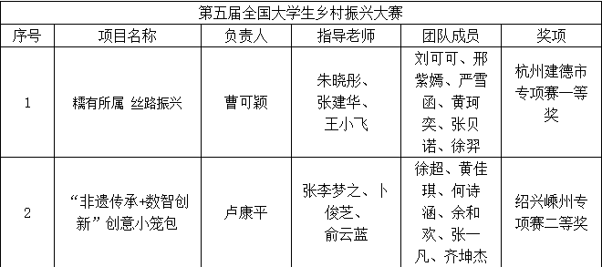 在第五届全国大学生乡村振兴大赛专项赛中,我院学子荣获杭州建德市专项赛一等奖1项与绍兴嵊州市专项赛二等奖1项;在第八届浙江省大学生乡村振兴创意大赛主体赛中,我院学子共获金奖2项、银奖1项、铜奖1项。