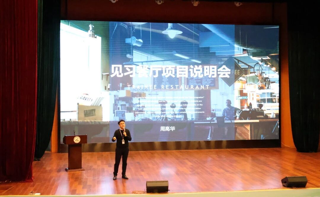 在经验分享环节,上一年度见习餐厅的优秀学生代表——最佳总经理徐锦灿、最佳行政总厨翁新睿、最佳餐厅经理叶胜峰,结合自身经历,系统回顾了餐厅运营的全过程,分享了在团队协作、菜品研发、服务管理以及突发情况应对等方面的实战心得,生动展现了从生涩到成熟的成长历程。